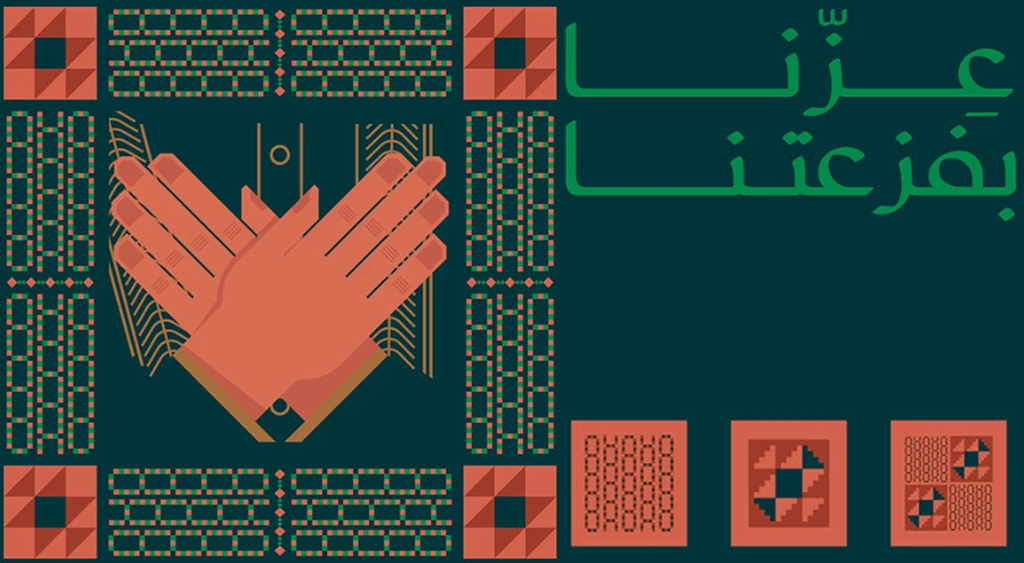 Faz’ah, atau semangat membantu sesama, menjadi nilai yang tertanam dalam kehidupan masyarakat Saudi. Dalam identitas Hari Nasional, simbol tangan bersilang menggambarkan solidaritas yang melampaui batas-batas nasional.