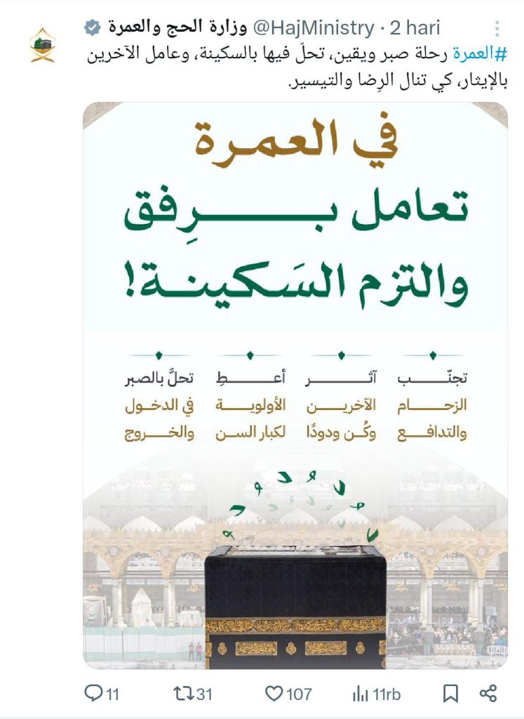 “Umrah adalah perjalanan kesabaran dan iman. Rangkullah ketenangan, perlakukan orang lain dengan itsar (mengutamakan orang lain), agar Anda diberikan kemudahan dan ridho Ilahi.” Kata kementerian Haji dan Umrah dalam sebuah caption di akun X.