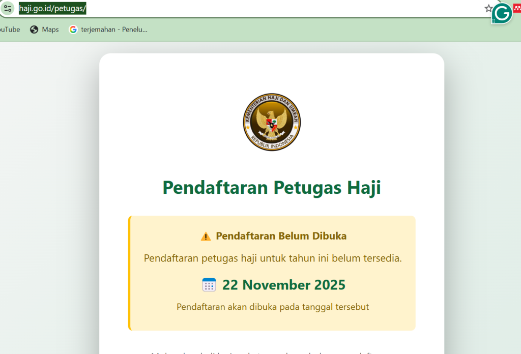 - Tahap I (Kabupaten/Kota): Berlangsung pada 20 November–5 Desember 2025. Agenda meliputi sosialisasi, pendaftaran, seleksi administrasi, hingga tes berbasis komputer (CAT) di kantor kementerian setempat. Pendaftaran peserta dimulai 22 November 2025, melalui website https://haji.go.id/petugas/