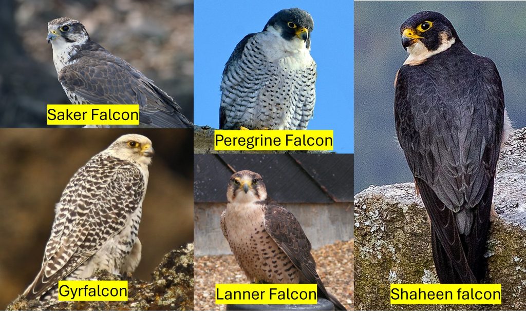 Dalam dunia falconry Arab Saudi, beberapa spesies burung falcon memiliki status istimewa karena kemampuan berburu, keanggunan, dan nilai historisnya: