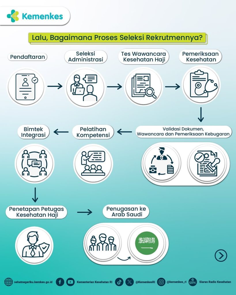 Rekrutmen ini menjadi bagian dari upaya Kemenkes untuk memastikan jamaah haji mendapatkan perawatan medis yang optimal, mengingat tantangan kesehatan yang dapat muncul selama prosesi ibadah haji. Tenaga Pendukung Kesehatan yang terpilih akan berperan penting dalam berbagai layanan kesehatan bagi Jamaah haji di Tanah Suci.